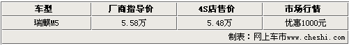 奇瑞高端品牌-瑞麒相繼推出M1、G5、X1之后,M1三廂版車型M5已經(jīng)悄然在北京地區(qū)銷售,1.3L手動(dòng)豪華版售價(jià)5.58萬(wàn)元。