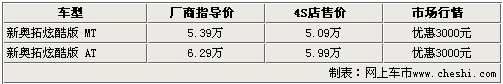 新奧拓炫酷版與普通版新奧拓車型相比,外觀、內(nèi)飾及配置方面均有明顯變化。炫酷版新奧拓車型新增了車頂擾流板、前后以及兩側(cè)運(yùn)動(dòng)包圍、側(cè)面防擦條,內(nèi)飾方面添加了炫彩裝飾套件、靈炫動(dòng)感座椅以及深色尚酷內(nèi)飾,配置方面將原有音響CD升級(jí)為GPS智能導(dǎo)航+音頻輸入接口。